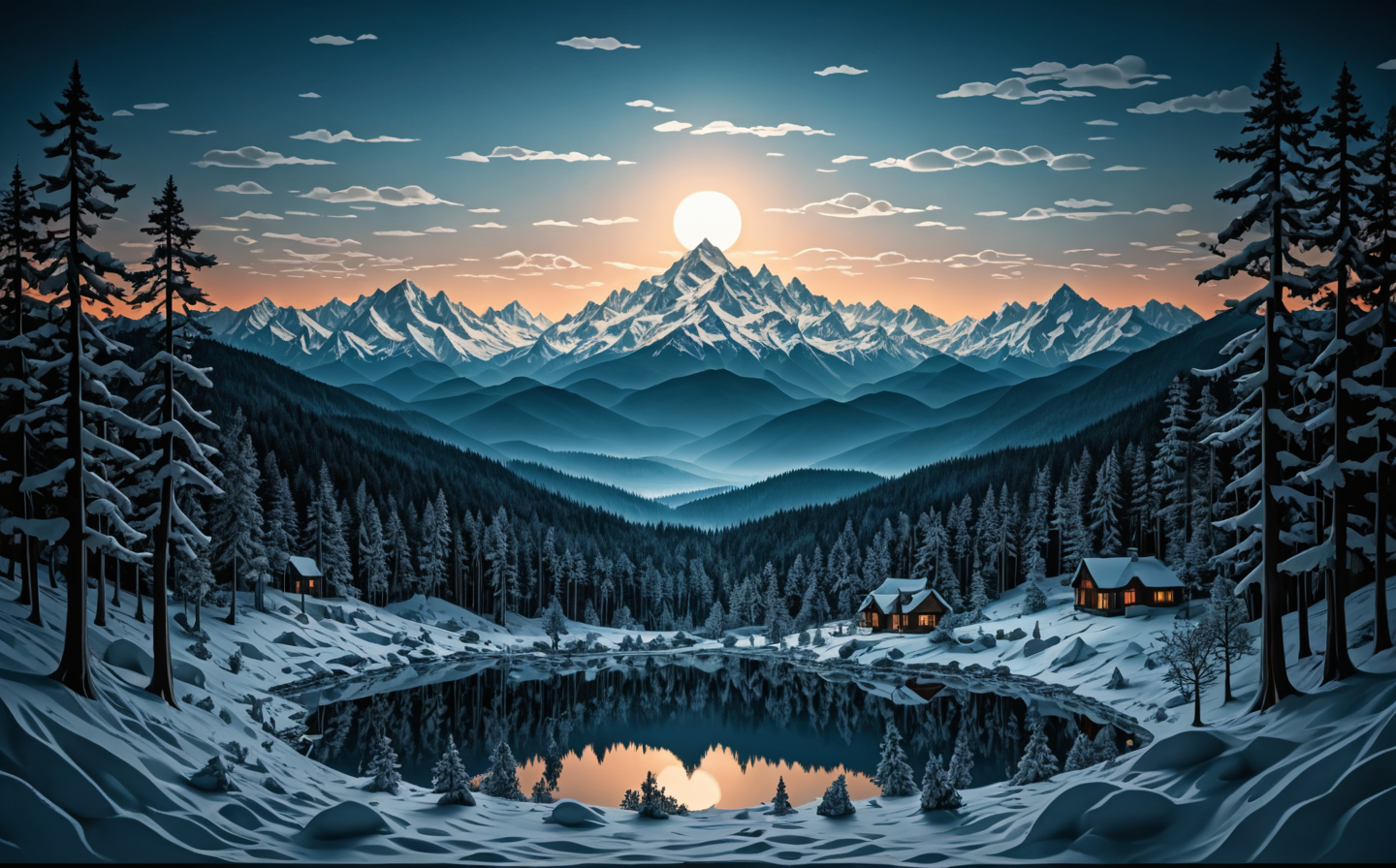 Thick layered papercut art of masterpiece, top quality, absurdres, award winning, 8k, highly detailed, beautiful landscape of a nature in winter, at dusk.<lora:EnvyZoomSliderXL01:-2> <lora:symmetrical:0.5> <lora:add-detail-xl:2>, Deep 3D, volumetric, dimensional, depth, thick paper, high stack, heavy texture, tangible layers