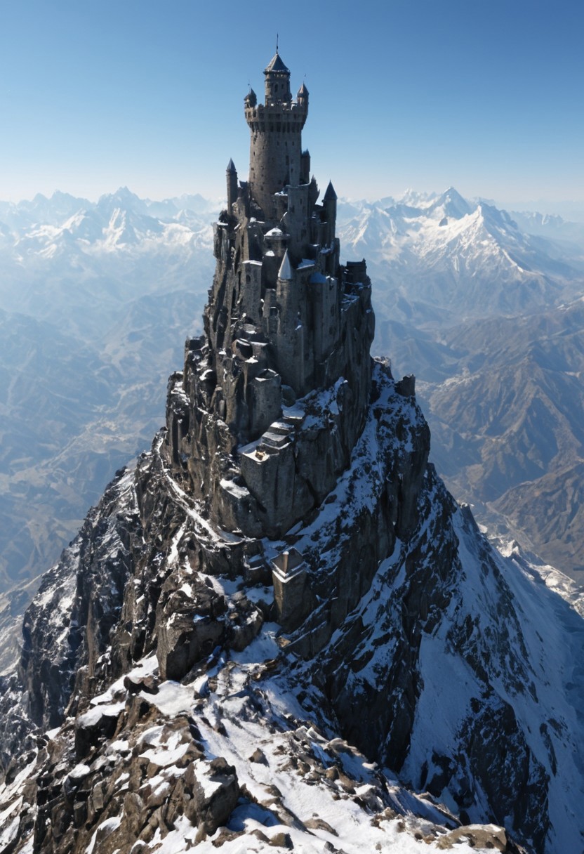 <lora:TheWeirdies_epoch_10:0.55> , advntr , epiCPhotoGasm-colorfulPhoto, score_9, score_8_up, score_7_up, score_6_up Durlag's Tower was hollowed out the mountain for the rock that made up his tower and used the space created to hide further treasure. This local landmark was the isolated keep of within the remains of the tower and used the defenses created by Durlag to keep both itself and the treasure safe. Some claimed that this creature was a lich. no humans (Tower fortress high on the highest peak of the highest mountain with all other sharp and snowing peaks far below . The tower looks out over a side vista of the tops of countless mountains in a huge range like the Himalayas, snow and frost cover every surface. ) ((maximum detail, supreme quality, 4k, best clarity))