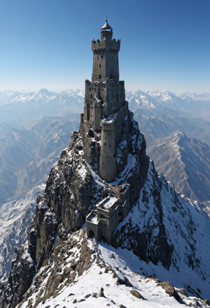 <lora:TheWeirdies_epoch_10:0.55> , advntr , epiCPhotoGasm-colorfulPhoto, score_9, score_8_up, score_7_up, score_6_up Durlag's Tower was hollowed out the mountain for the rock that made up his tower and used the space created to hide further treasure. This local landmark was the isolated keep of within the remains of the tower and used the defenses created by Durlag to keep both itself and the treasure safe. Some claimed that this creature was a lich. no humans (Tower fortress high on the highest peak of the highest mountain with all other sharp and snowing peaks far below . The tower looks out over a side vista of the tops of countless mountains in a huge range like the Himalayas, snow and frost cover every surface. ) ((maximum detail, supreme quality, 4k, best clarity))