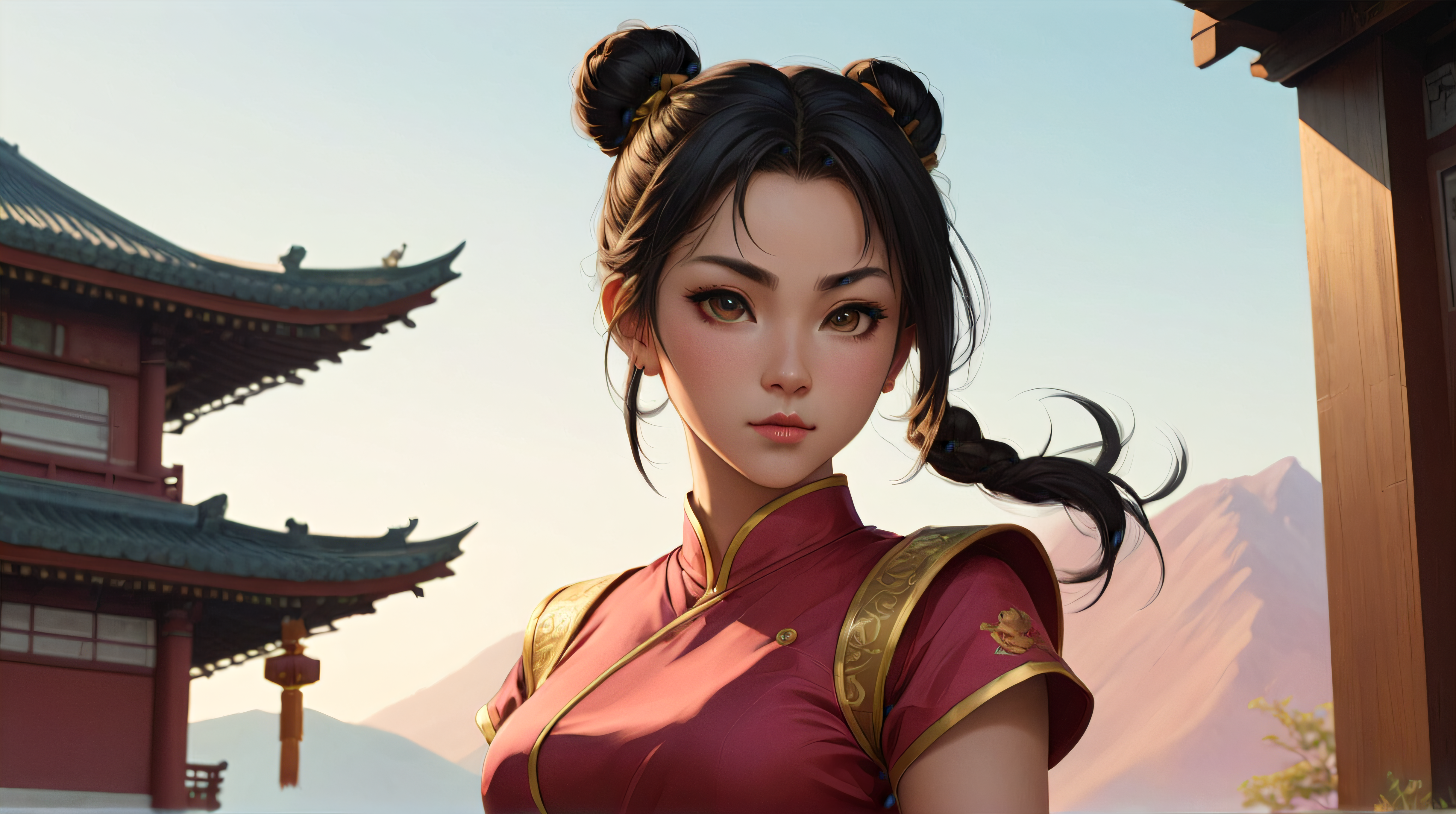 1girl, portrait of beautifull chun-li, large breasts, Eiichiro Oda style, anime style, solo, chinese-clothes, bare_arms, closed_mouth, black hair, perfect face, perfect brown eyes with white sclera, serious, frown, sky, volumetric lighting, best quality, masterpiece, intricate details, sharp focus, hyper detailed, trending on Artstation, upper body, sf2 chun, chinese clothing, wide hips, muscular female, pink clothes, pantyhose, pelvic curtain, puffy short sleeves, bun cover, sash, standing, rating:safe, realistic, Athletic body, floral background, chinese temple background, <lora:epiCRealismHelper:0.8> <lora:real_skin:0.8>
