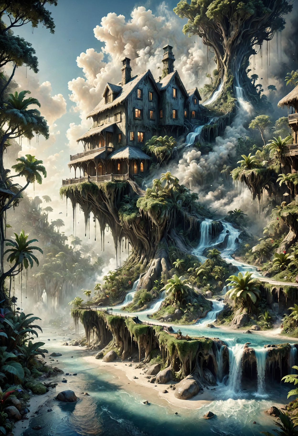 DonM5h4d0wM317XL ski resort town mansion in tropical rainforest biome <lora:DonM5h4d0wM317XL:1>