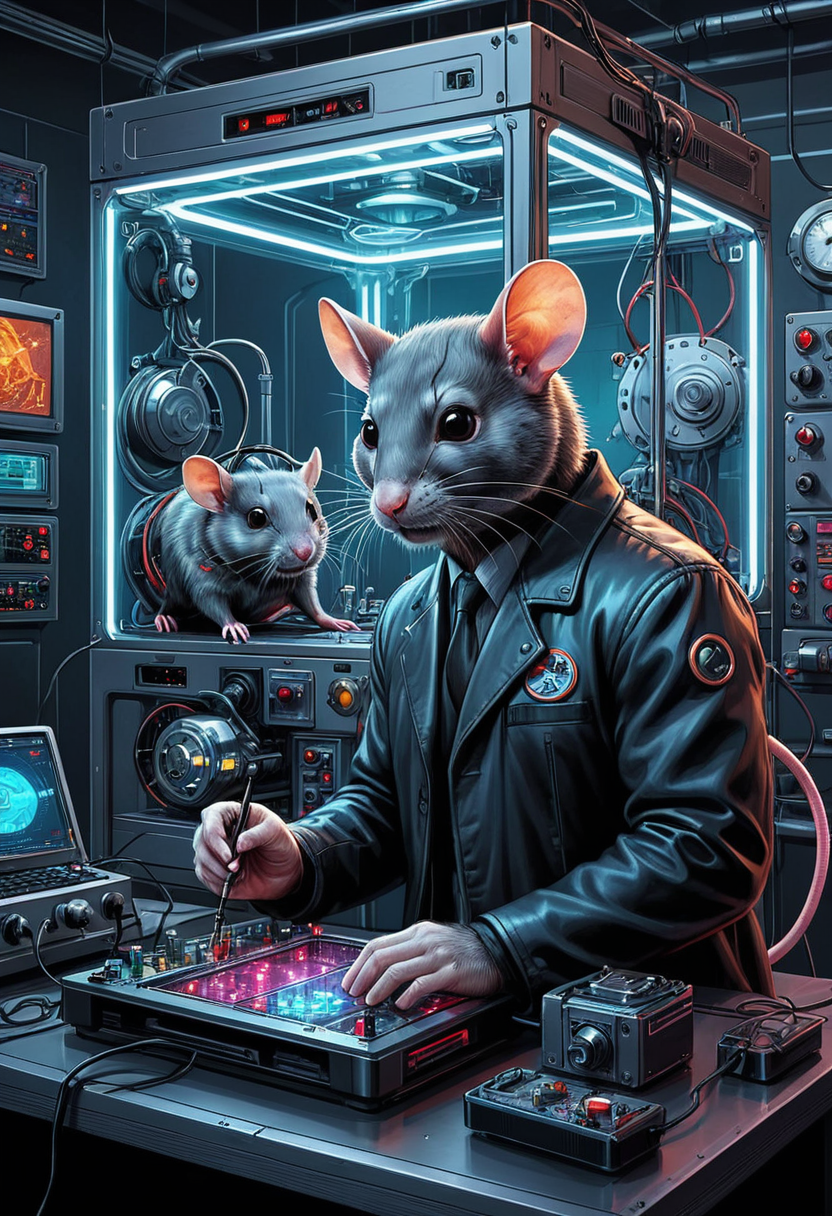 masterpiece, photorealistic, intricate, high quality, popular on artstation, surrealistic, pop art, concept art, matte colors, retro scifi cover art, (diabolical lab rats:1.6) plotting to guide human evolution through preforming science experiments, figure inside crustal cube filled by liquid stands behind, line art, , headphones, <lora:add-detail-xl:0.8> <lora:InkArtXL_1.2:0.6> OverallDetailXL