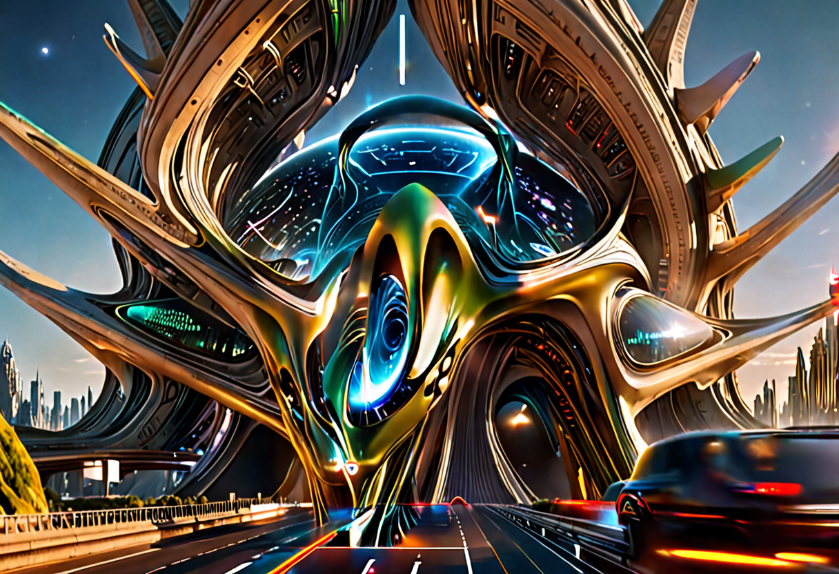 8k, alien city with highway, strange, alien geometry, otherworldly, bizarre,