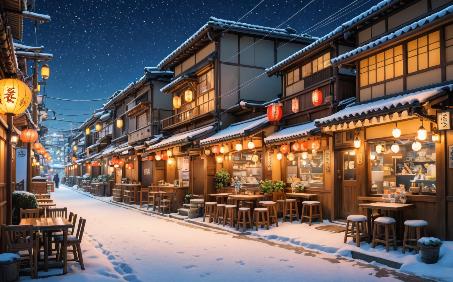 kawaii style, masterpiece, top quality, absurdres, award winning, 8k, highly detailed, beautiful landscape of a izakaya in winter, at night.<lora:EnvyZoomSliderXL01:-2> <lora:symmetrical:0.5> <lora:add-detail-xl:2>, cute, adorable, brightly colored, cheerful, anime influence, highly detailed