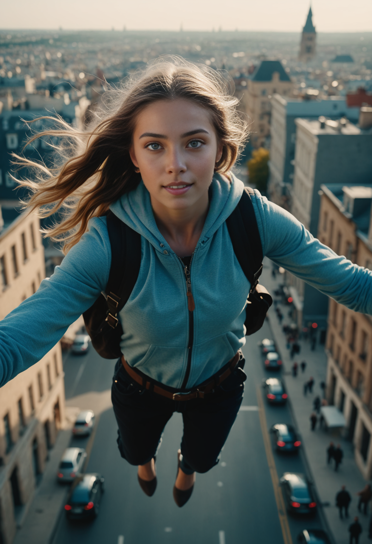 cinematic film still A young girl with blue eyes in street clothes is flying high above a city . shallow depth of field, vignette, highly detailed, high budget, bokeh, cinemascope, moody, epic, gorgeous, film grain, grainy