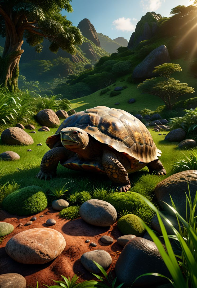 (cinematic lighting, extremely detailed, high detail, hires textures, incredibly detailed, intricate details, masterpiece, photorealism, true masterpiece, Intricately designed), (grass, rocks, trees), (giant tortoise)