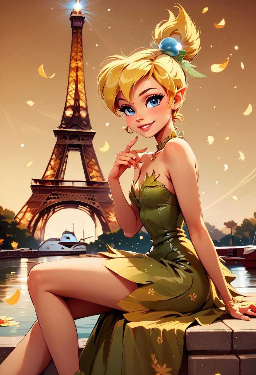 score_9, score_8_up, score_8, medium breasts, (curvy), cute, eyelashes, rating safe, BREAK, zzEiffelTower in background, 1girl, tinkerbell from the movie peter pan , solo, hat, dress, bare shoulders, sitting, dress, watercraft, boat, sitting on wall, side view, looking at viewer, smile, BREAK, blooming stars, luminescent petals, otherworldly fragrance blurry background, BREAK, smile, looking at viewer, abstract background, zPDXL, Expressiveh