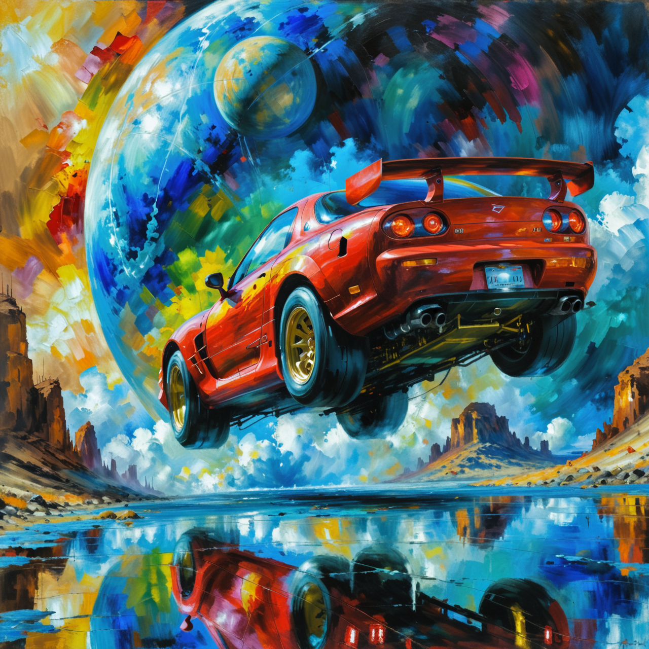 score_9, score_8, score_7, score_8_up, score_7_up, (best quality, masterpiece, highres:1.2), absurdes, surreal, supercar, front view, mazda rx-7, illegal death race, (neo-futuristic, cyberpunk, futuristic, synthvawe, by Alex Schomburg, Mark kolobaev), towering megastructure, Floating Islands, Planet with gravity-defying islands offering unique ecosystems., melting into the horizon, vanishing point, holographic, (no human:1.6), night, glossy, rain, depth of field, outrun, in motion, pursuit, motion blur, neon trails, dark theme, glowing, neon, aesthetic, fixl-art(creative), detailed, color contrast, primary colors, shar focus, (zoomed:1.5), dramatic angle, extreme forced perspective, <lora:rough-oil-sat-mega-adam-e:0.85> oil painting <lora:xl_more_art-full_v1:0.5>