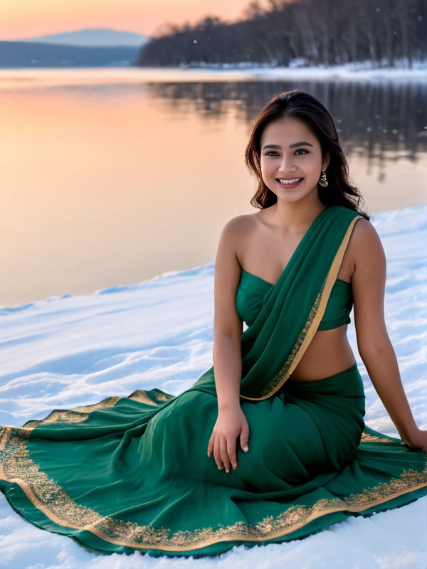 masterpiece, stunning, award winning, absurdres, 8k, focused, highly detailed, vivid color, high contrast, sharp details, ((photograph)) (medium shot:0.5), ((full body, portrait)), (profile:0.25), ((subject in focus)), (beautiful detailed face), of: a female malaysian, wearing sari sarong, laying down, lazily in frozen lakeside at evening, snowy weather, looking Flirty, A playful smile, arched eyebrows, and a slightly tilted head. <lora:DetailedEyes_V3:1> <lora:EnvyZoomSliderXL01:-1> <lora:FaceDeetsPonyXL2-09:1> <lora:hand 4:1> <lora:Pretty_Emotional_Faces_1:0.5> <lora:add-detail-xl:3>