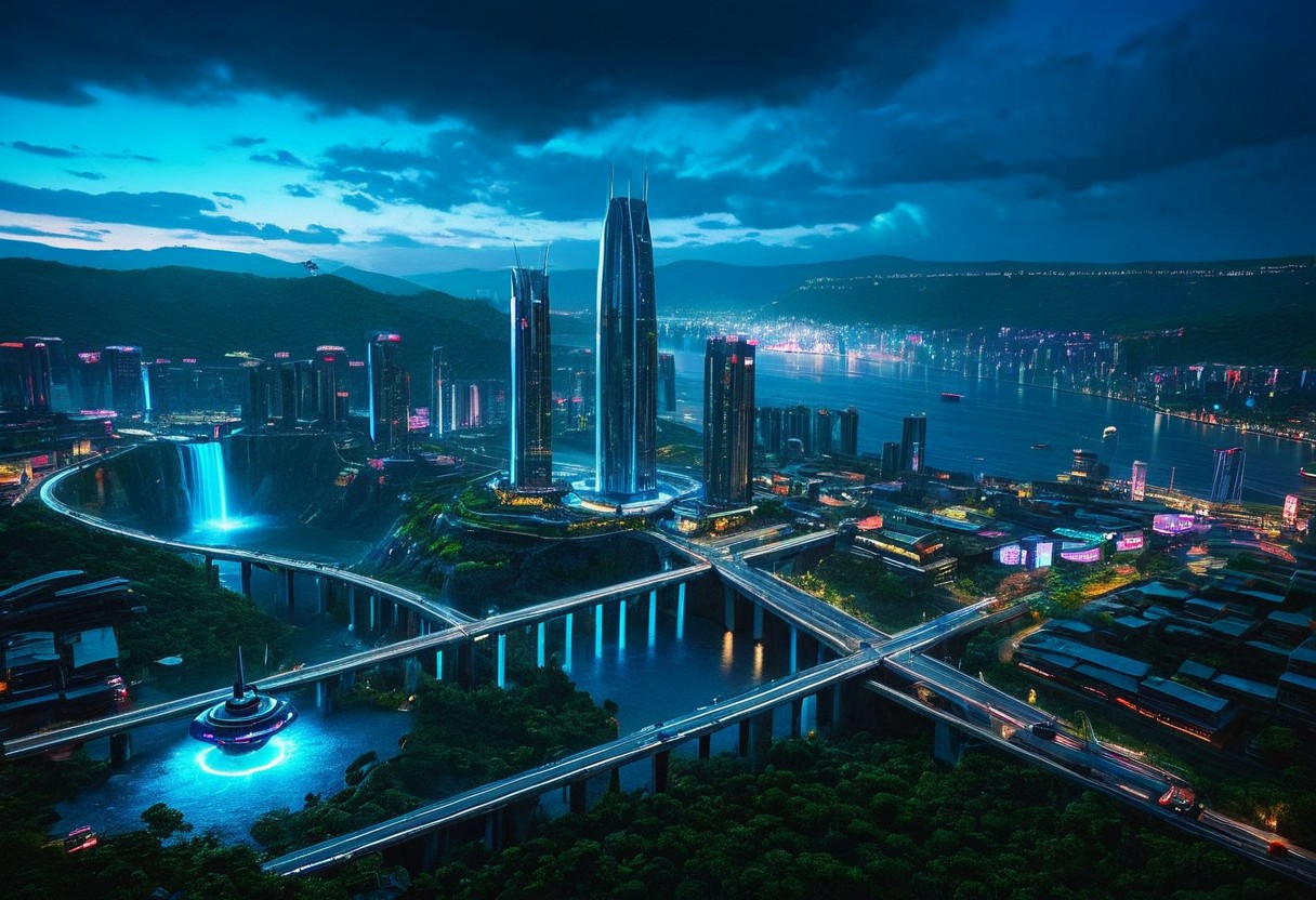 (midnight time, absolute darkness:1.28), (aerial view angle balcony overlooking city below, establishing shot,:1.2), (cyber megatropolis built on a multiterraced faultline with ground level difference:1.4), (multidimensional buildings on cliffside with searchlights:1.22), (tall skyscrapers and mega residential block with (overhead bridge) between megablocks and view into vast malls underground:1.26), alleyways and smoking chimneys, (immense scale of vast cityscape with cyberpunk slums in background), futuristic highways over city park (artificial waterfall and inland lake), vietnamese electric poles, (hovering futuristic flying APC vehicles), (glowing LED billboards:1.24), vibrant (cohesive color grading), 4k, highres, best quality, dramatic, cinematic, epic, (concept art, digital art, realistic, professional masterpiece, dynamic, depth of field, tilt shift, iris blur, bokeh, sharp clarity:1.2), fine intricate details, great lighting, dappled soft lighting, volumetric lighting, detailed highlights, rim lighting