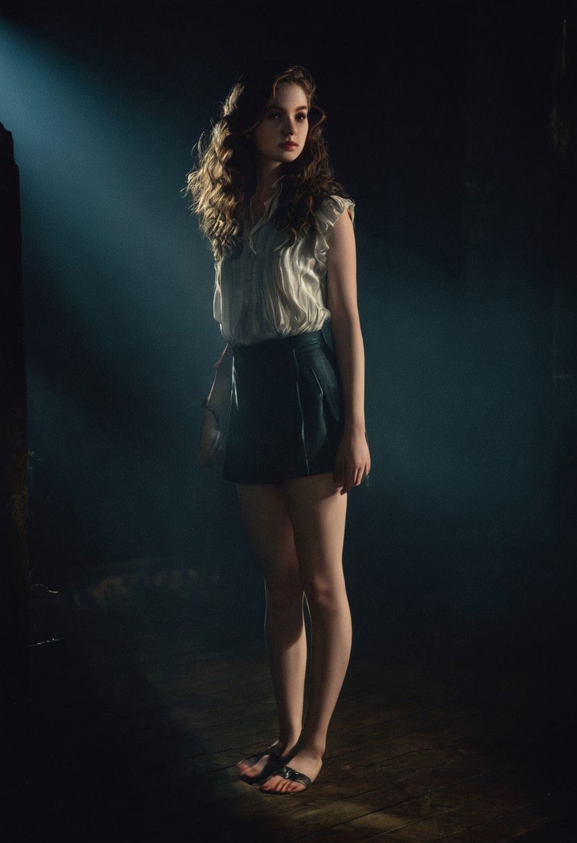 (RAW photo, best quality), ((Nostalgia,1980s syle)),(A girl with a literary atmosphere:1.2),(realistic, photo-realistic:1.3), extremely delicate and beautiful, Amazing, finely detail, masterpiece, ultra-detailed, highres,best illustration, best shadow,intricate,depth of field,1girl,(long legs:1.1),long hair,messy hair,((((low key,dark scene,dimly lit)))),fat,(((soft lighting:1.4))),(pale skin:1.4),(shy smile),(cinematic angle),sharp focus, volumetric fog, 8k UHD, DSLR, high quality,( film grain:1.4), Fujifilm XT3,(looking at viewer)