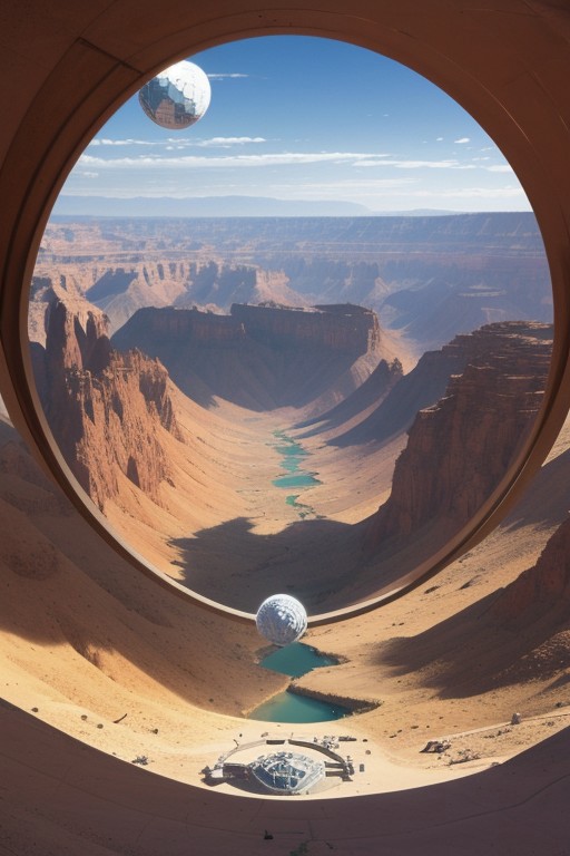 ([by Buckminster Fuller|by Santiago Calatrava]:1.5), (Giant Metal Orb.:0.5), floating metal sphere, canyon, desert landscape, mountains in the distance