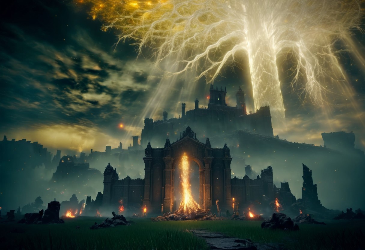 score_9, score_8_up, score_7_up, score_6_up, score_5_up, score_4_up, 1enormous tree up on a mountain in the background, the tree reaches the sky, the leaves of the tree are golden and light up the clouds with a reddish-golden hue, around the base of the tree there is a fantasy city, (the tree trunk is burning), god rays filters through the canopy, at night, a vast grass plain in the foreground scattered with tombstone, a bonfire with a golden flame in the foreground surrounded by sparkles, dark, low-key, w3ers, scenery, gloomy,