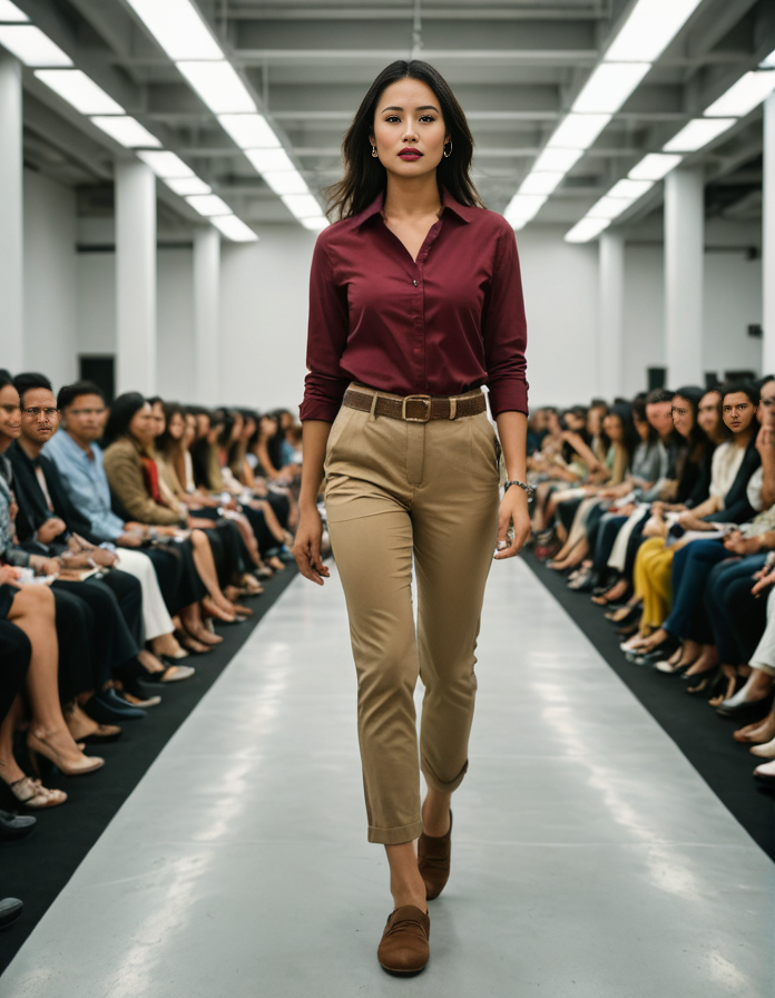 masterpiece, stunning, award winning, absurdres, 8k, focused, highly detailed, vivid color, high contrast, sharp details, ((photograph)) (futuristic aesthetic) (medium shot:0.5), ((full body, portrait)), (profile:0.25), ((subject in focus)), (beautiful detailed face), (symmetrical face), of: a female nepalese strutting on a ((fashion runway)) with a smug expression, wearing collared shirt, belted chinos, and driving moccasins <lora:StS_age_slider_v1_initial_release:1> <lora:EnvyZoomSliderXL01:-2> <lora:add-detail-xl:3>