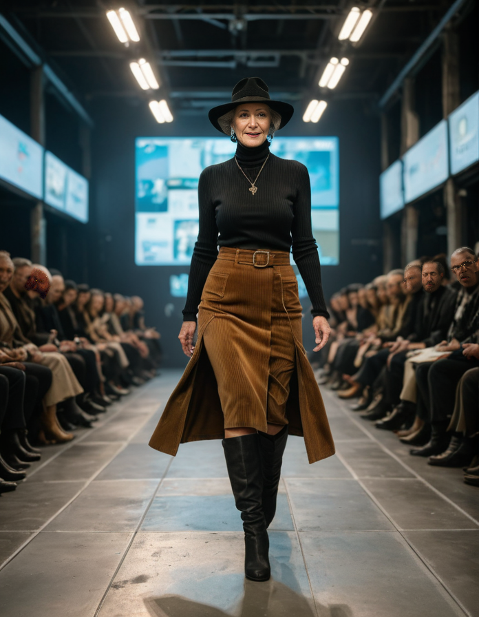 masterpiece, stunning, award winning, absurdres, 8k, focused, highly detailed, vivid color, high contrast, sharp details, ((photograph)) (Cyberpunk aesthetic) (taken with a Canon EOS 5D Mark IV DSLR Camera) (medium shot:0.5), ((full body, portrait)), (profile:0.25), ((subject in focus)), (beautiful detailed face), (symmetrical face), of: a very old female portuguese strutting on a ((fashion runway)) with a smug expression, wearing corduroy skirt with a ribbed turtleneck and a pair of knee-high boots, finished with a wool fedora <lora:StS_age_slider_v1_initial_release:5> <lora:cybepunk:0.5> <lora:EnvyZoomSliderXL01:-2> <lora:add-detail-xl:3>