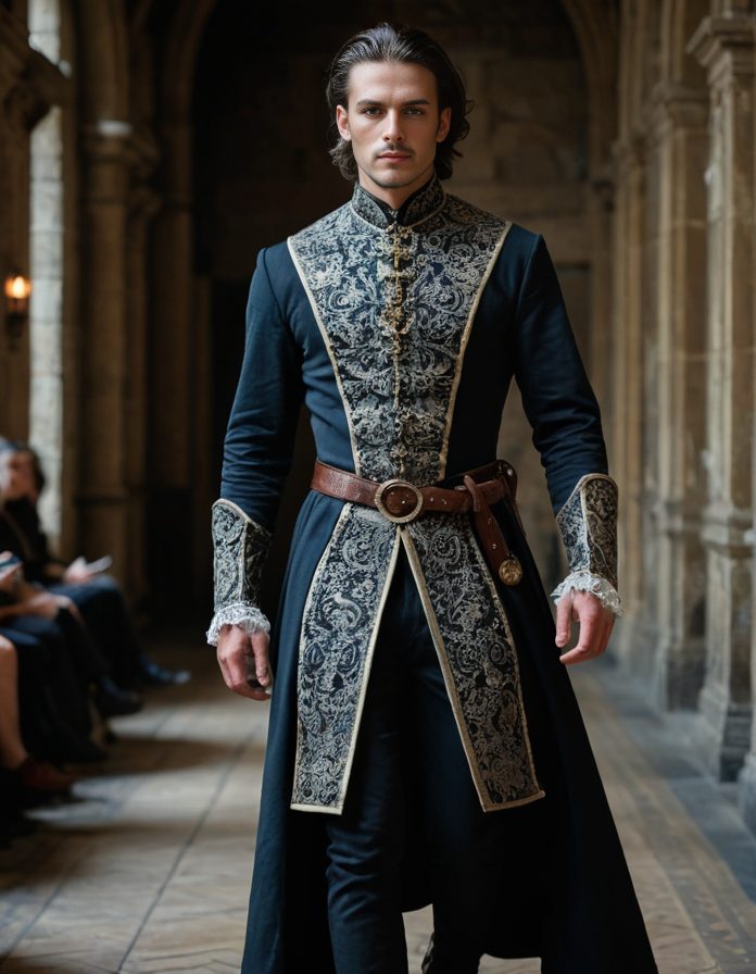 masterpiece, stunning, award winning, absurdres, 8k, focused, highly detailed, vivid color, high contrast, sharp details, ((photograph)) (medieval fantasy aesthetic) (medium shot:0.5), ((full body, portrait)), (profile:0.25), ((subject in focus)), (beautiful detailed face), (symmetrical face), of: a male french strutting on a fashion runway with a smug expression, wearing victorian-style dress, choker necklace, and ankle boots. <lora:StS_age_slider_v1_initial_release:1> <lora:add-detail-xl:3>