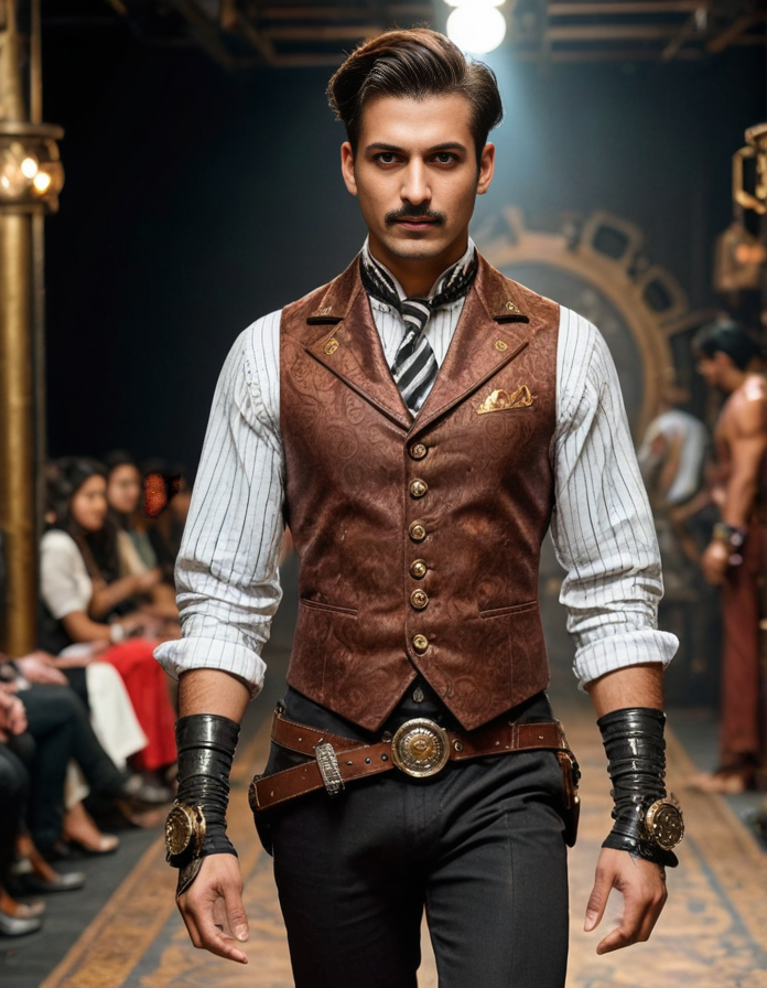 masterpiece, stunning, award winning, absurdres, 8k, focused, highly detailed, vivid color, high contrast, sharp details, ((photograph)) (steampunk fantasy aesthetic) (medium shot:0.5), ((full body, portrait)), (profile:0.25), ((subject in focus)), (beautiful detailed face), (symmetrical face), of: a male bihari strutting on a ((fashion runway)) with a smug expression, wearing striped shirt, fitted vest, and leather gloves <lora:StS_age_slider_v1_initial_release:1> <lora:add-detail-xl:3> <lora:DonMSt34mPXL-000006:0.25> donmst34mpxl