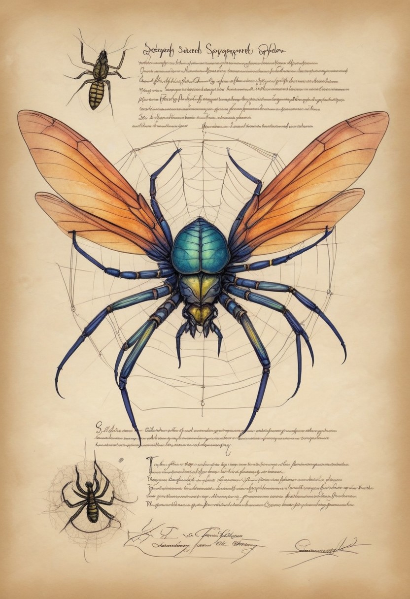 colorful ink concept sketch on parchment paper of a scorpion spider with dragonfly wings, info, stats, explanations, text, concept art