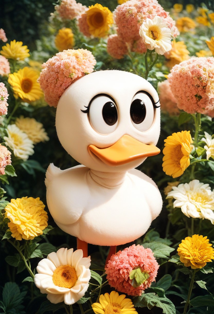 Score_9, score_8_up, score_7_up, webby vanderquack, cute lovable duck, among flowers, creepy creature, photo