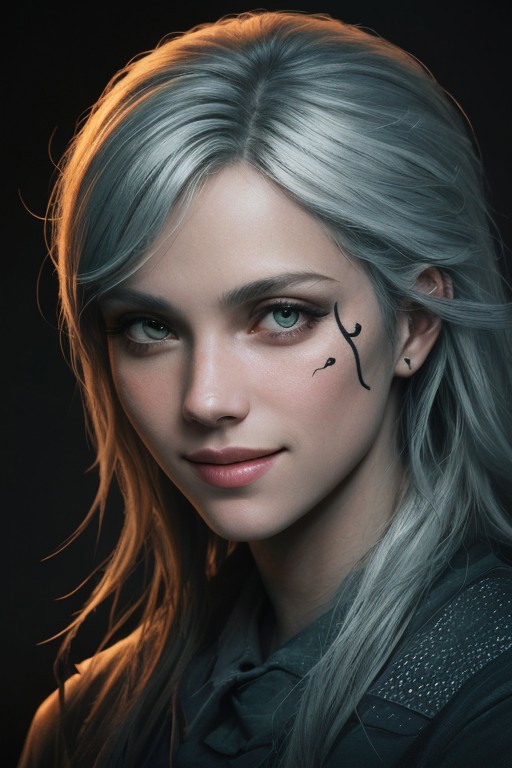 Professional photo by Richard Awedon, woman with pale skin, face tattoos, glowing eyes, wry smile, beautiful lighting, alternative composition, uncommon framing, close-up, 4k, sharp focus, high resolution, realistic detailed skin, detailed eyes, deep cleavage, 8k UHD, DSLR, high quality, dark hues, silverteal palette, low key,backligh, atmospheric haze, cinematic style
