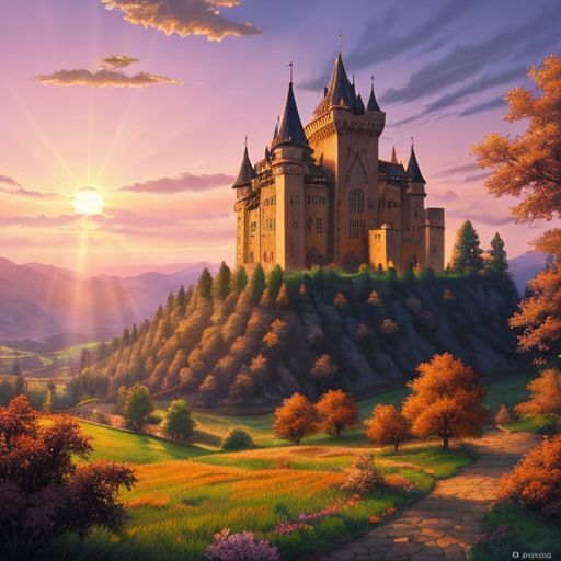 an ancient castle surrounded by high walls and towers that reflect the rays of the setting sun. Beautiful shades of orange, pink and purple can be seen against the sky, which creates an atmosphere of a warm and peaceful sunset. The silhouettes of trees and bushes around the castle add depth and texture to the painting, as well as create a sense of privacy and mystery of this place. All together, this illustration conveys the beauty and grandeur of an ancient castle shrouded in the mystical rays of sunset