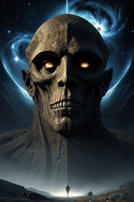 masterpiece, best quality, absurdres, illustration, photorealistic, monster, eldritch monster, colossal eye, ethereal tentacles, cosmic void, ancient inscriptions, floating monoliths, dark stars