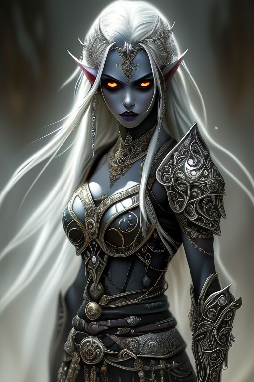 8k portrait of beautiful drow priestess with silver hair, white skin, intricate, elegant, highly detailed, majestic, digital photography, art by artgerm and ruan jia and greg rutkowski surreal painting, silver filigree, a female drow warrior priestess, dark makeup, intricate armor, belt, bracers, jewelry, <lora:Drow:1>, (masterpiece, sidelighting, finely detailed beautiful eyes: 1.2), hdr,