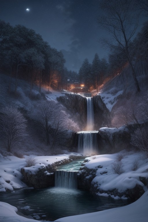 score_9,score_8_up,score_7_up,Capture the mesmerizing beauty of a majestic waterfall cascading down a moonlit snowy landscape. Surround it with rolling hills, towering trees, and a serene, peaceful atmosphere, 4k, ultra detailed, well detailed, high definition