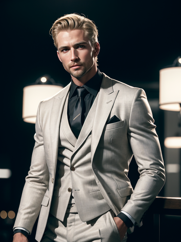 Caucasian blonde man in grey trousers and suit jacket, muscle man with short haircut, short beard, Forty-years-old, hard look, (looking at viewer), solo, soiree, evening party, (glamour, high life, luxury), photoreal, photorealistic, uhd, 16k, RAW photo, 32k, masterpiece, hard shadows, sharp focus, cinematic, Chiaroscuro Lighting, dramatic lighting, high resolution, high quality, fashion photography, elegant, captivating, cinema still, high depth of field, Clear Visuals, Ultra-HD-details, White Balance Shade, ISO25600, Shutter Speed 1 sec, DSLR, Kodak T-Grain