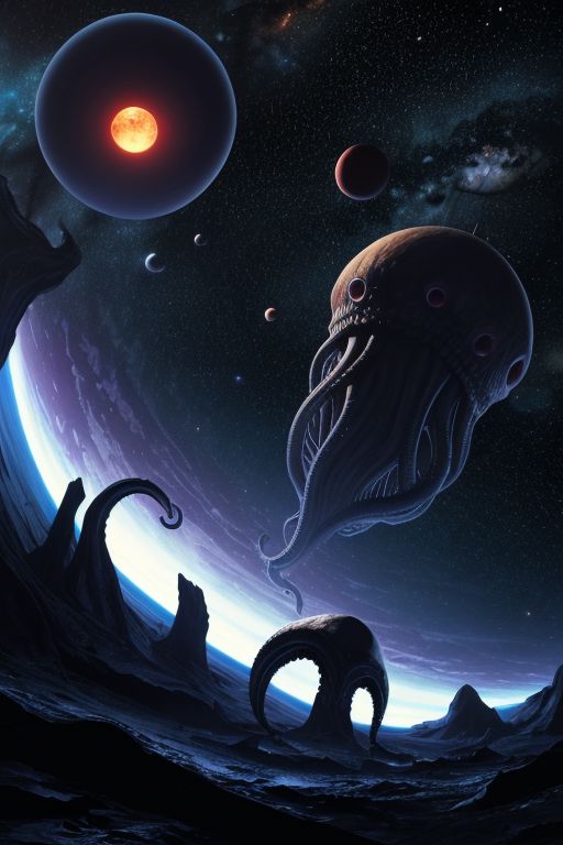 masterpiece, best quality, absurdres, Explore the depths of space, where eldritch beings lurk. Tentacled monstrosities drift near distant planets, their presence both awe-inspiring and terrifying.
