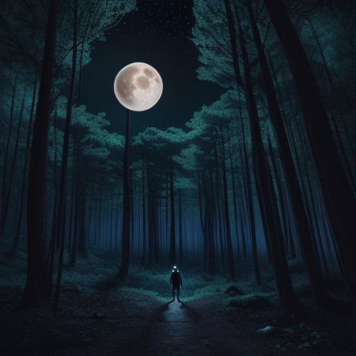 Create an award-winning landscape image depicting the vastness of space with an exaggeratedly large moon. Set the scene at night in a dense forest. The oversized moon dominates the sky, casting an ethereal glow over the landscape. Stars twinkle brightly, enhancing the sense of infinite space. In a forest clearing below, a UFO hovers, emitting a bright, otherworldly tractor beam. The beam is in the process of abducting a human figure, their silhouette illuminated by the beam's light. Tall, shadowy trees surround the clearing, their tops gently swaying in the cool night breeze. The image should evoke awe and mystery, with a striking contrast between the cosmic elements and the earthly forest. Use deep blues and purples for the night sky, silvery white for the moon, and vivid light for the UFO beam. Elements to include: Vast, star-filled night sky. Exaggeratedly large moon with detailed craters. Dense forest with tall, dark trees. Clearing with the abduction scene. Bright tractor beam from the UFO. Silhouetted human figure being abducted. Style: Realism with a touch of surrealism. High contrast between dark forest and bright moon/UFO beam. Emphasize scale and depth to highlight the vastness of space and the forest setting. Capture a visually stunning and emotionally evocative landscape that tells a story of mystery and wonder.