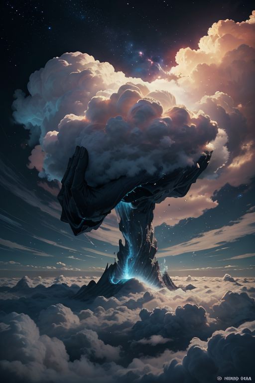 Aion Teleos, Proarche, extremely detailed, sharp detail, sharp focus, (dramatic perspective), epic composition, puffy_clouds, fluffy_clouds, soft_clouds, (giant perfect hands composed of clouds:1.5), (shapes in the clouds:1.2), floating, clouds, space, nebulae, eyeball nebulae, mysterious, black hole, neutron star, gas giant, chasm