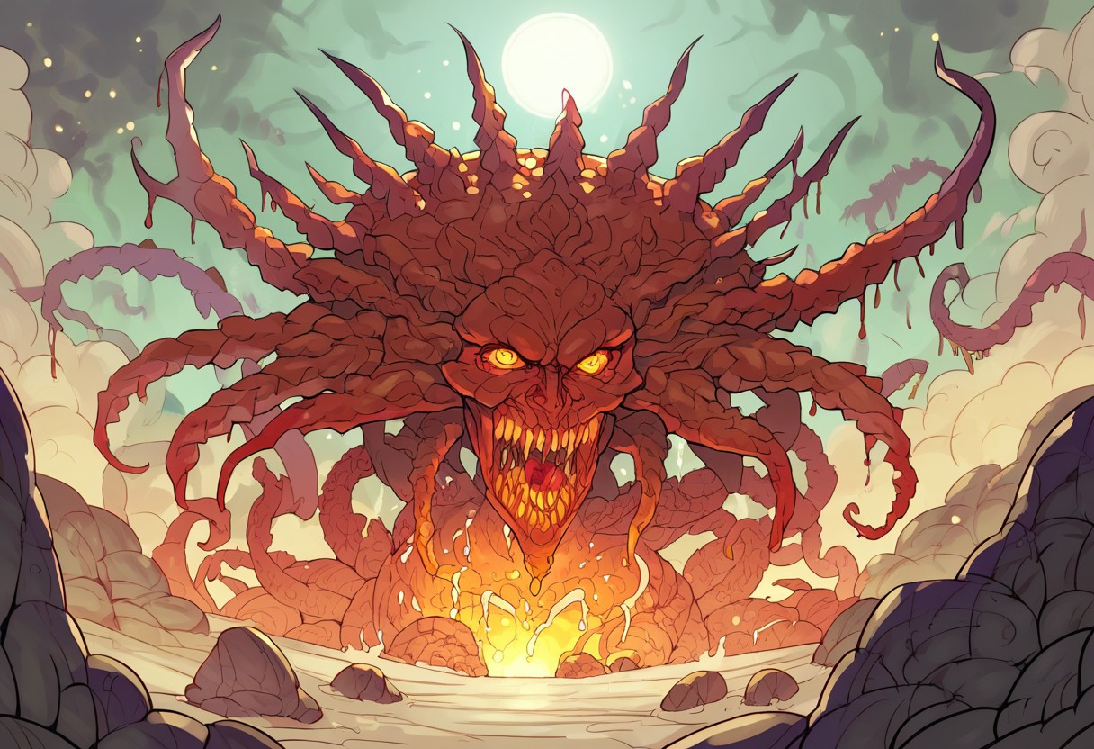 score_9, score_8_up, score_7_up, very detailed, highly detailed texture, masterpiece, score_9, score_8_up, score_7_up, score_6_up, score_5_up, score_4_up, cartoon, ultra-detailed, (best quality:1.1), full character portrait, <lora:Zazu-a:1> hattiezazu, digital art, soft light, score_9, score_8_up, score_7_up, score_6_up, score_5_up, score_4_up, a dark foreboding scene, a colossal ancient creature emerging from the depths of the sea, made out of oil for blood (ral-motoroil) tranzp, transclucid skin, glowing organs showing, camera focused on body, humanoid body, standing, the creature has a massive tentacled form with glowing hazardous eyes casting an eerie light, a lone figure holds up a red torch standing on the rocky shore, green hazardous lines acros the body of the creature, its light barely illuminating the surroundings, The atmosphere is heavy with tension the sea crashing violently against the rocks, the creature's immense size dwarfing the solitary human, lone figure against the ancient, otherworldly beast, color palette is dark, deep blacks and greys, high contrast, <lora:MJ52:0.5>, <lora:add-detail-xl:1>, <lora:ral-ertmsphr:0.5> ral-ertmsphr, cthulhu cthulhu, ral-ertmsphr, nuclearhazard, ral-motoroil, Art by Boris Vallejo, Boris Vallejo Art Style