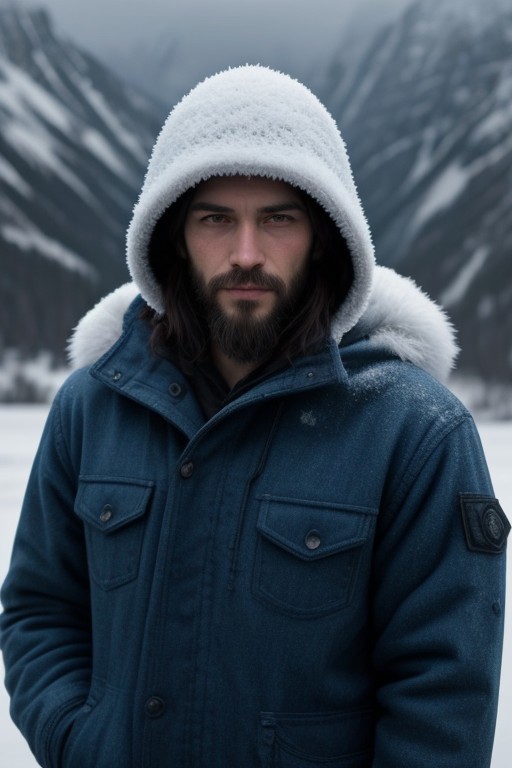 portrait, 1man , american, black crew cut, 52 y.o., cowboy_shot, teeth, frost in beard, , realistic, solo, cold outdoors, snowy, blue winter jacket, hood, fur, highly detailed face, ,Muscular Frame looking at the viewer, winter mountain area, close to viewer,