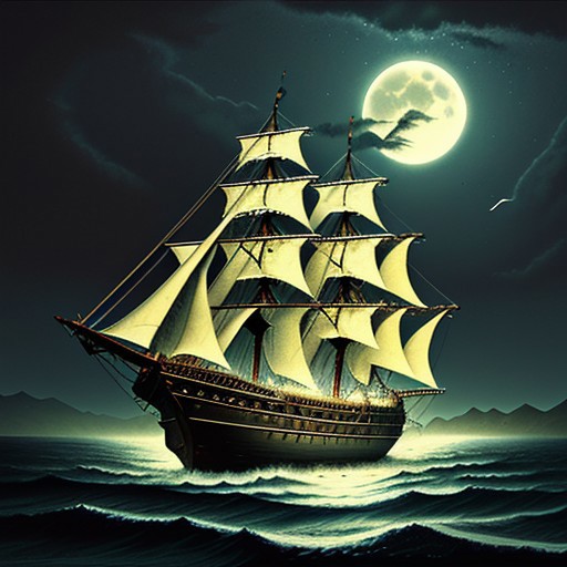 A ghost ship adrift in a moonlit sea, its tattered sails whispering secrets of the past