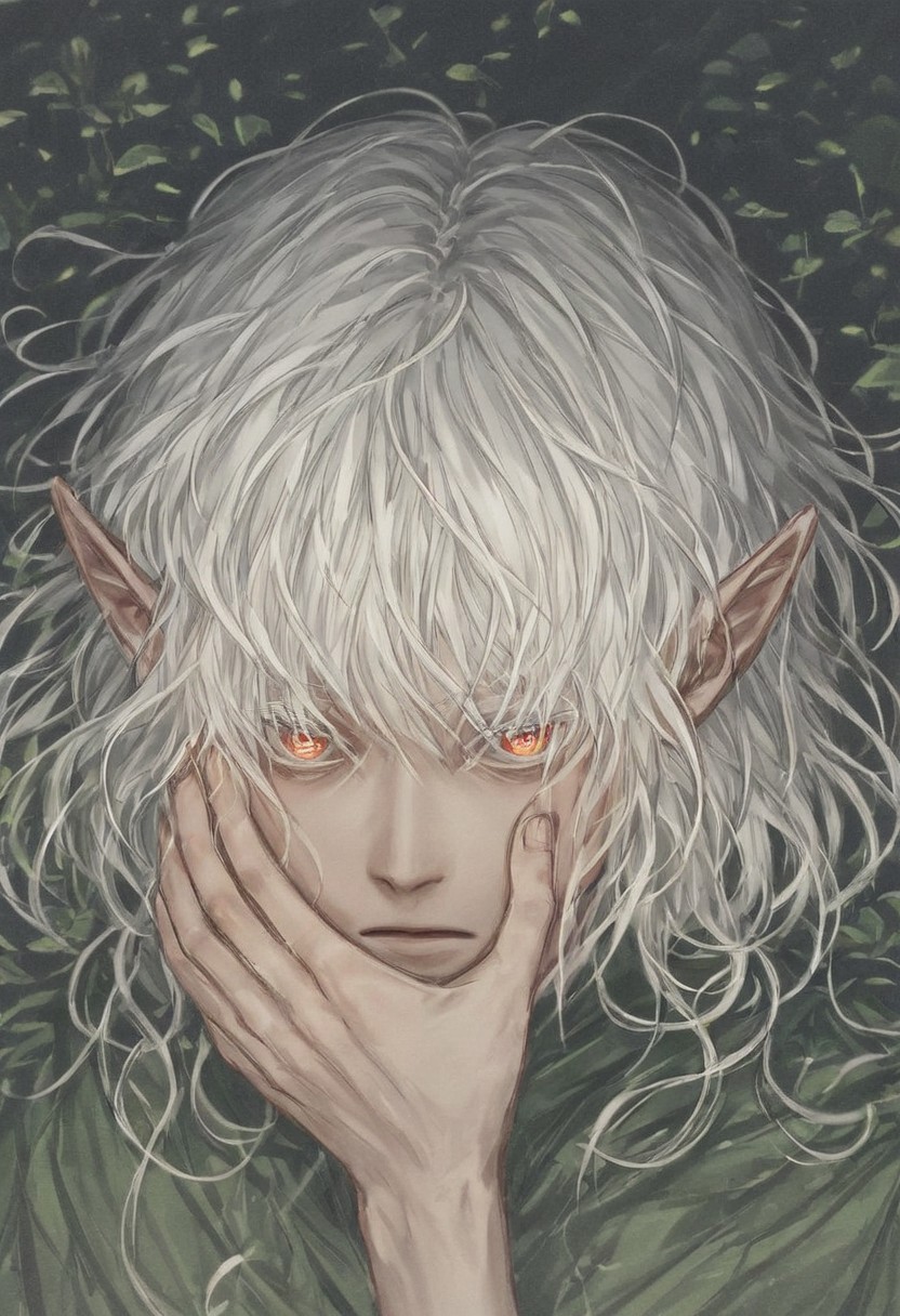 yum4rt 1 wood elf young man, albino, white short hair, red albino eyes. Green wizard robes ((clean lines, source: anime, detailed fingers, high quality, best quality, masterpiece, rating: g score: 9, score: 8 up))