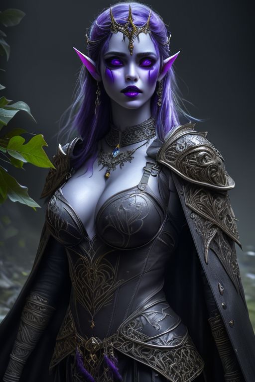 RAW photo, (masterpiece:1.3), subsurface scattering, heavy shadow, (high quality:1.4), (intricate, high detail:1.2), professional photography, HDR, High Dynamic Range, realistic, ultra realistic, photorealistic, high resolution, film photography, ambient lighting, atmospheric effects, <lora:detail_slider_v4:2>, OverallDetail, a female drow warlock, dark makeup, intricate leather armor with leaf patterns, jewelry, cape, tiara, large breasts, flawless skin, purple lip gloss, <lora:Drow:0.8>, epiCPhoto