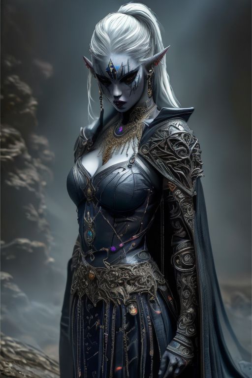 RAW photo, (masterpiece:1.3), subsurface scattering, heavy shadow, (high quality:1.4), (intricate, high detail:1.2), professional photography, HDR, High Dynamic Range, realistic, ultra realistic, photorealistic, high resolution, film photography, ambient lighting, atmospheric effects, <lora:detail_slider_v4:2>, OverallDetail, a female drow warlock, dark makeup, intricate leather armor with arcane patterns, jewellery, cape, tiara, large breasts, flawless skin, lip gloss, <lora:Drow:0.8>, epiCPhoto