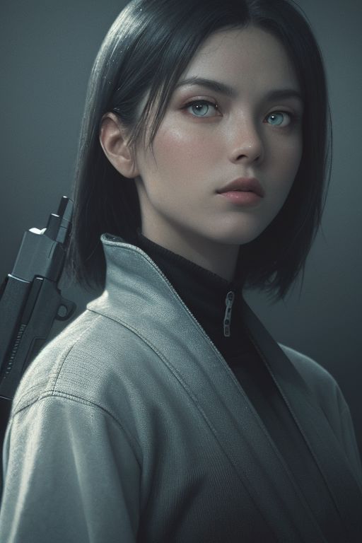 Professional photo by Richard Awedon, mysterious woman, black hair, glowing blue eyes, holding a silver gun, beautiful lighting, alternative composition, uncommon framing, close-up, 4k, sharp focus, high resolution, realistic detailed skin, detailed eyes, deep cleavage, 8k UHD, DSLR, high quality, dark hues, silverteal palette, low key,backligh, atmospheric haze, cinematic style