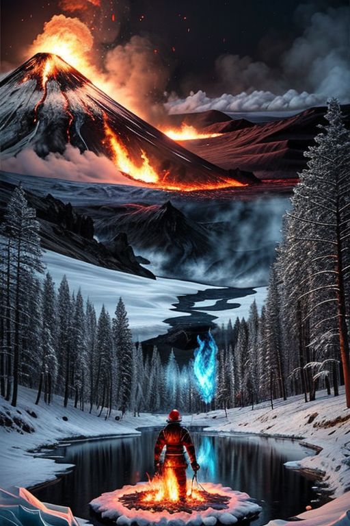 Fire and ice depicted in close proximity, emphasizing the contrast between them. Use warm and cool colors to emphasize the contrast in temperature. Fire and ice textures should be distinct and contrast with each other. Dynamics: The image should show movement and energy, symbolizing the struggle between the two elements. Fire can be seen spreading and ice can crack or melt. Dynamic lines and shapes can be used to emphasize movement. Symbolism: The image can symbolize various concepts, such as: The fight between good and evil The power of nature Change and transformation The cycle of life and death Scenes: Fire and ice clashing in a natural environment, for example: An erupting volcano surrounded by glaciers Molten lava flowing down an icy slope Forest fire raging among snowy forests Fire and ice used in a human context, for example: Blacksmith working with red-hot metal Emotion: Fear and excitement Beauty and majesty Calm and reflection Use colors, composition and lighting to convey the desired emotion. Sample prompt: