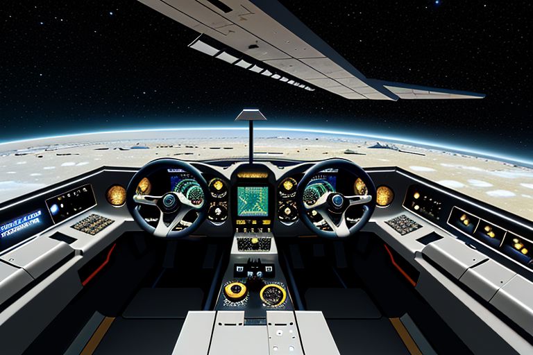 on the surface of europa moon, above the glacier, in cockpit view of spaceship, dark space with some stars in front, lights shining on landing pad, cockpit is detached from landing platform, cockpit is an open cockpit for larger view, heading to docked spaceship
