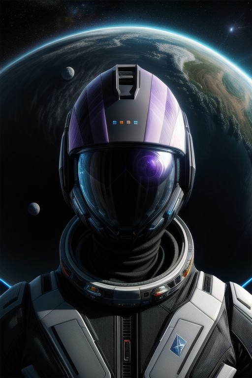 A futuristic space fighter with a sleek design and black exterior, purple highlights, futuristic, sci-fi, space, stars space, planets in distance, masterpiece, high quality