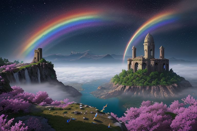 A breathtaking world of floating islands suspended in a luminous twilight sky with a perpetual soft purple hue and twinkling stars. Each island has diverse ecosystems like lush forests and crystal lakes. Waterfalls cascade from island to island, creating rainbows in the mist. Skyfolk with wings or magical devices glide through the air. Ancient ruins hint at a once-unified land now scattered across the heavens.