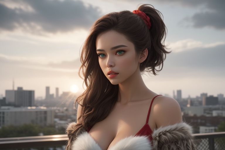 xlgirls, green eyes, brown hair, red scrunchie, long ponytail, large breasts, bare shoulders, fur trim, cleavage, midriff, legwarmers, 1girl,(realistic), (hyperrealism), (photorealistic:1.4), looking at the viewer, detailed eyes, parted lips, fuzzy sweater, detailed face, (upper body:1.2), blurry background, outdoors, high budget, bokeh, cinemascope, moody, epic, gorgeous, film grain, grainy