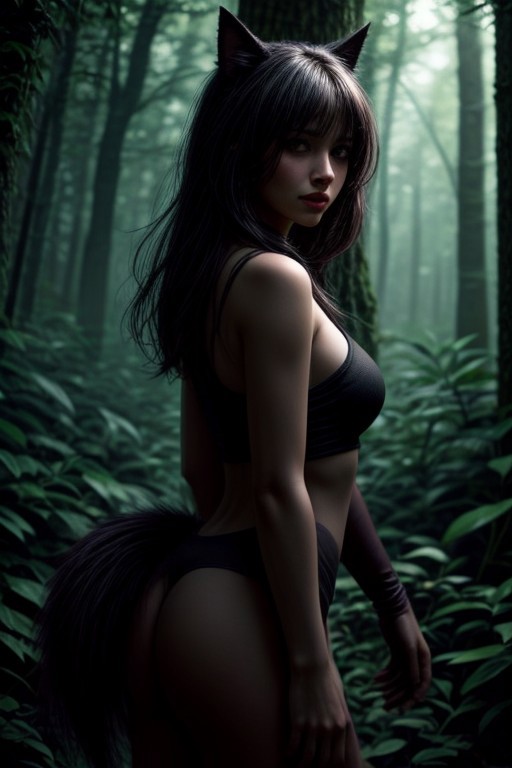 Cute catgirl in a big lush alien forest, lush trees,warm tones, warm light, beautiful sceenery, fluffy tail, lineart,