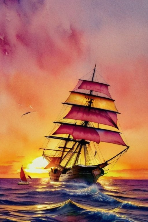 Hyper-quality, 16k hyper-detailed, extremely complex, hyper-maximalist, watercolor, ink, sailing ship (sharp focus :1.3) in the background Absolutely mesmerizing sunset with a mixture of orange, red, pink and yellow in the sky. The water is crystal clear. The scene is dynamic and exciting, seagulls soar high in the air, gently swaying