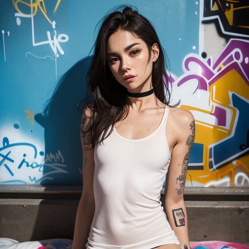 portrait, sitting on bed, naked, (8k, RAW photo, best quality, ultra high res, photorealistic, masterpiece, ultra-detailed, Unreal Engine), legs wide, kneeling, missionary, camera low, camera close, absurdres, best quality,1girl, solo, streaked hair, choker, (graffiti:1.25), paint splatter, arms on hips, breasts perky, leaning back, looking at camera, armband, thigh strap, streaked hair, paint on body, upturned eyes, head down, head tilt, tight, thin, small, perfect face,tattoo