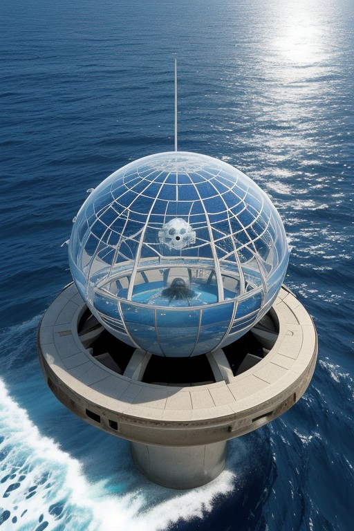 ([by Buckminster Fuller|by Santiago Calatrava]:1.5), (Giant Metal Orb.:0.5), floating metal sphere, open ocean, curling wave, blue water