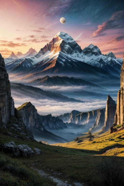 masterpiece, best quality, absurdres, illustration, photorealistic, strange terrain, alien flora, multiple moons, distant mountains, colorful sky, unknown creatures