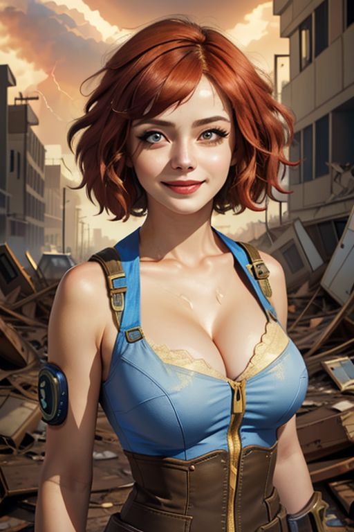 <lora:lora_taylor_v1_from_v1_160:1.2> a stunning photo going through rubble of smiling woman smirking, natural lighting, messed up make up epic character composition, sharp focus, film grain, under the rain, radioactive storm, red hair, curly, fallout aesthetic , fallout_girl